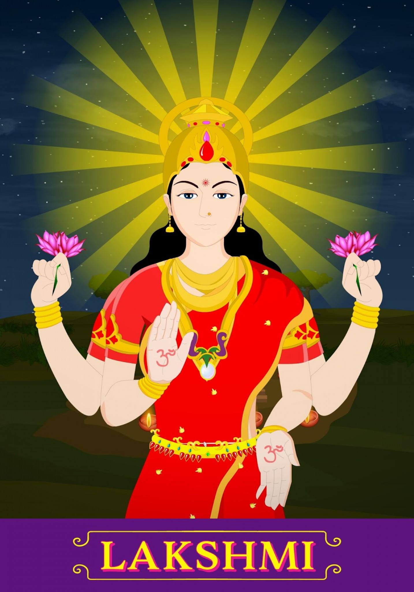 Lakshmi is the goddess of wealth and prosperity, both material and spiritual whose story is told in the India's greatest epic among all gods and is here as a full HD animated Lakshmi is depicted as a beautiful woman of golden complexion, with four hands, sitting or standing on a full-bloomed lotus and holding a lotus bud, which stands for beauty, purity and fertility.